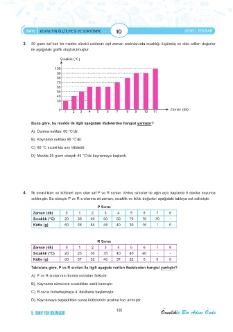 3. 50 gram saf katı bir madde sürekli ısıtılarak eşit zaman aralıklarında sıcaklığı ölçülmüş ve elde edilen değerler