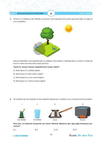 3. Özdeş P ve R kaplarına eşit miktarda su koyuluyor. Sonra kaplardan birisi güneş ışığı altına diğeri ise gölge bir