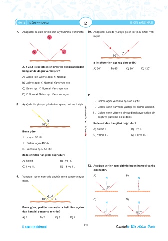 9. Yansıyan ışının normalle yaptığı açıya yansıma açısı A) N B) N