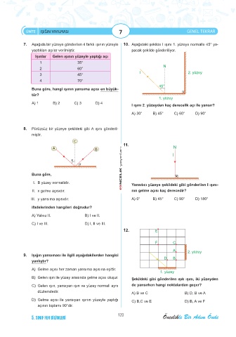 7. Aşağıda bir yüzeye gönderilen 4 farklı ışının yüzeyle 10. Aşağıdaki şekilde I ışını 1. yüzeye normalle 45° ya-