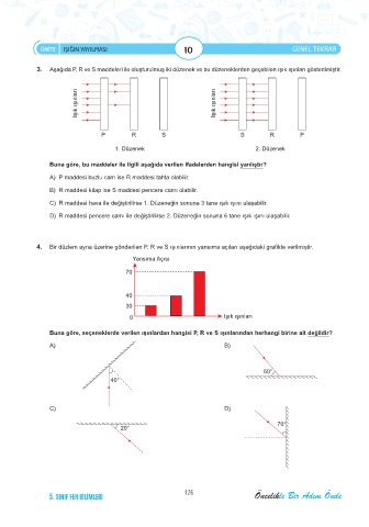 4. Bir düzlem ayna üzerine gönderilen P, R ve S ışınlarının yansıma açıları aşağıdaki grafikte verilmiştir.