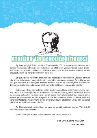 Ey Türk gençliği! Birinci vazifen, Türk istiklâlini, Türk Cumhuriyet’ini, ilelebet, mu-