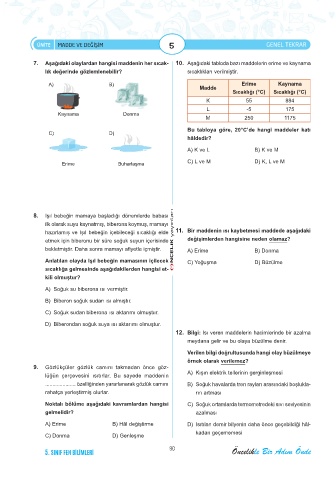 7. Aşağıdaki olaylardan hangisi maddenin her sıcak- 10. Aşağıdaki tabloda bazı maddelerin erime ve kaynama