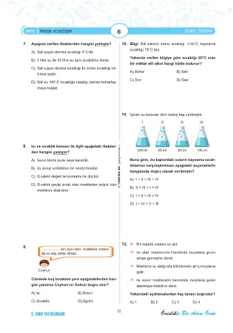 7. Aşağıda verilen ifadelerden hangisi yanlıştır? 10. Bilgi: Etil alkolün erime sıcaklığı -114°C, kaynama
